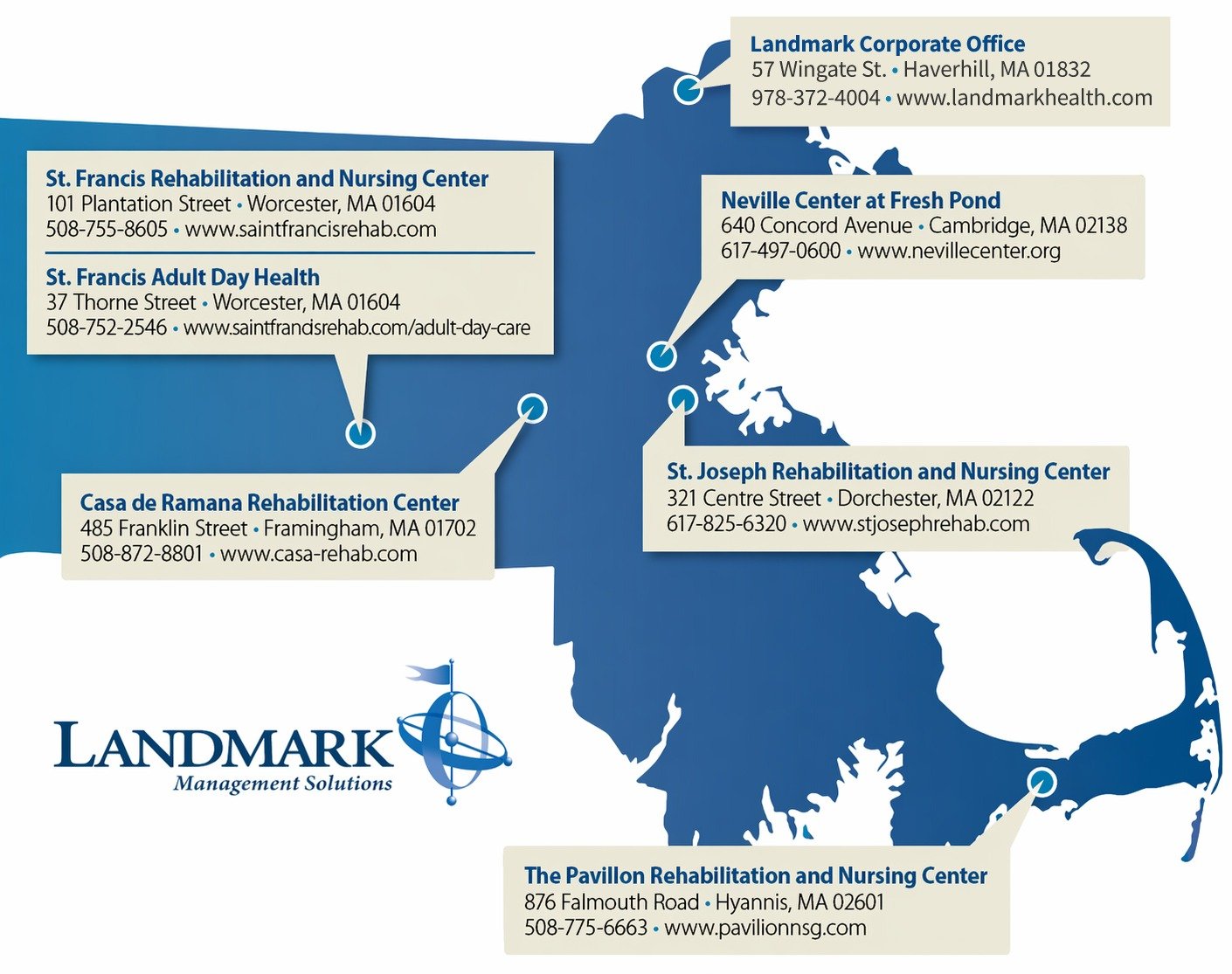 Landmark is a New England based owner, operator and management services provider dedicated to the Seniors Housing & Rehabilitative Care Industry. With particular concentration and specialized resource capacity in the skilled nursing sector, Landmark’s unique experience qualifications and business history has contributed to its valued reputation for achieving results. The hallmark of Landmark’s operating philosophy is its integrated approach to the business - where optimal and sustainable results are predicated on the interdisciplinary delivery of resident care and health care services.